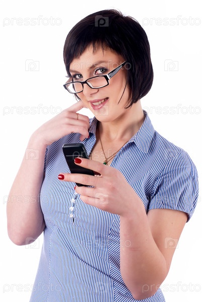 Молодая красивая женщина с мобильным телефоном над белым