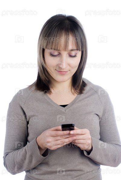 Молодая привлекательная женщина обменивается сообщениями по мобильному телефону, изолированному на белом фоне