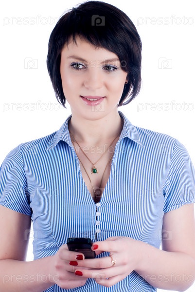 Молодая привлекательная женщина обменивается сообщениями по мобильному телефону