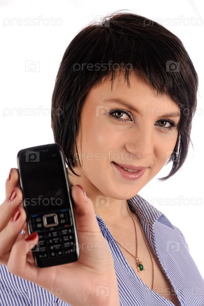 Красивая брюнетка показывает мобильник на телефоне