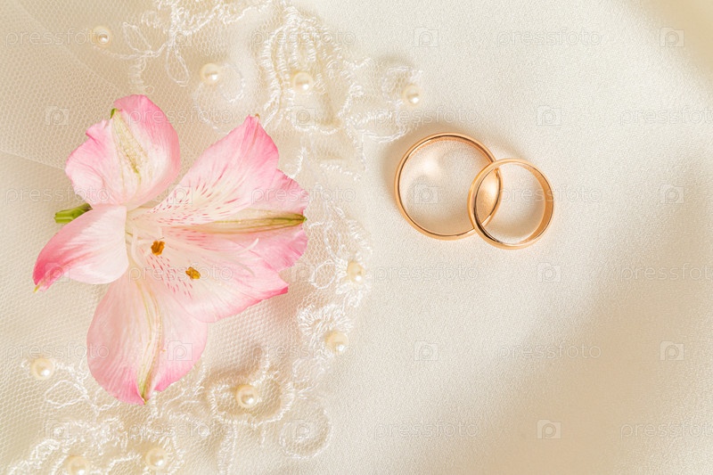 Два золотых обручальных кольца и розовый цветок астромерии на бежевом атласном фоне. Свадебный фон. Копия пространства