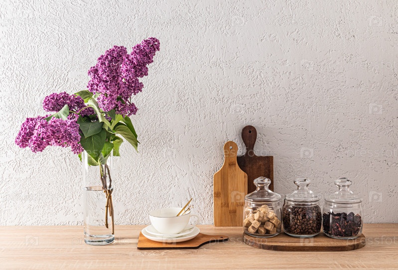 Стильный кухонный фон с частично кухонной деревянной столешницей и местом для хранения в стеклянных банках сыпучих продуктов. Ваза с цветами