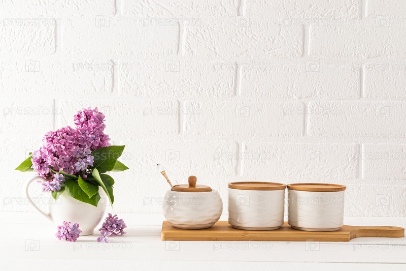 Красивый фон кухни в светлых тонах в минималистском стиле. Три керамические банки для хранения на деревянной доске и букет сирени в кувшине
