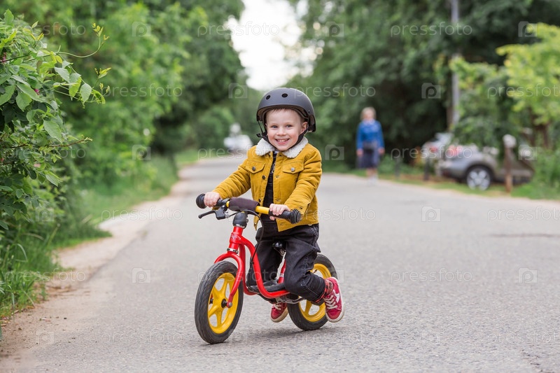 Веселый маленький мальчик катается на велосипеде в шлеме на улице. Счастливый ребенок занимается активным спортом. Защита. Страхование жизни и безопасность детей