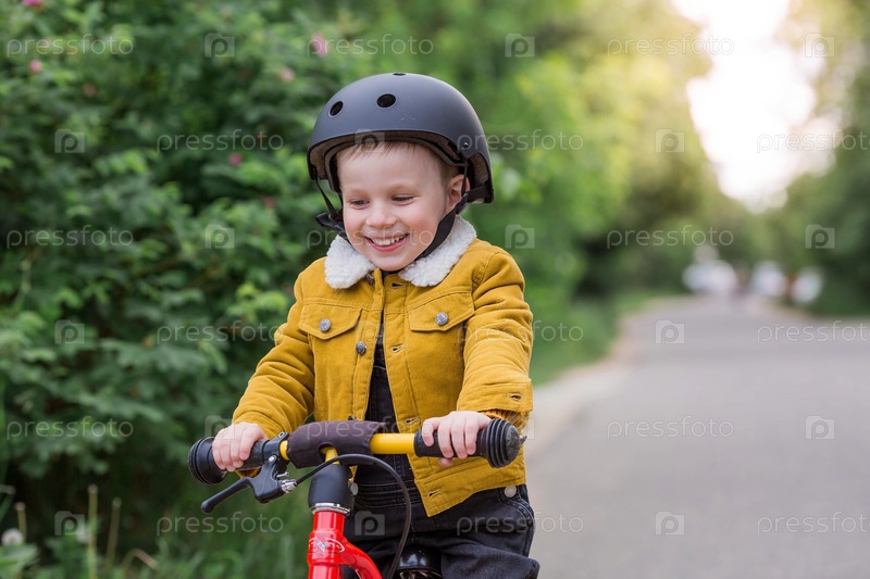 Веселый маленький мальчик катается на велосипеде в шлеме на улице. Счастливый ребенок занимается активным спортом. Защита. Страхование жизни и безопасность детей