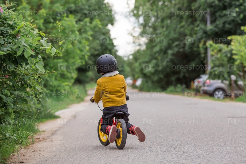 Веселый маленький мальчик катается на велосипеде в шлеме на улице. Счастливый ребенок занимается активным спортом. Защита. Страхование жизни и безопасность детей