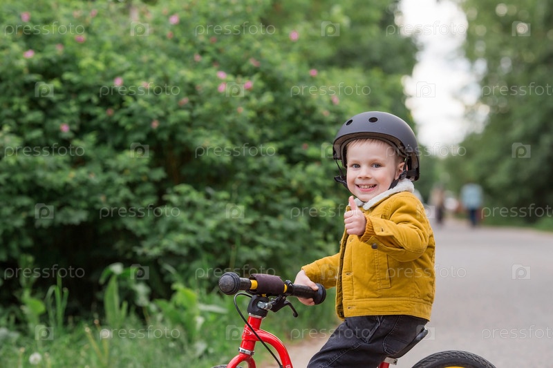 Веселый маленький мальчик катается на велосипеде в шлеме на улице. Счастливый ребенок занимается активным спортом. Защита. Страхование жизни и безопасность детей