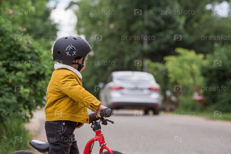 Веселый маленький мальчик катается на велосипеде в шлеме на улице. Счастливый ребенок занимается активным спортом. Защита. Страхование жизни и безопасность детей