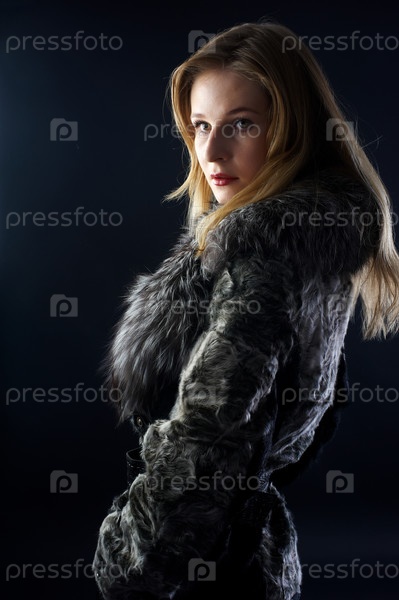 Молодая красивая женщина в шубе на черном фоне