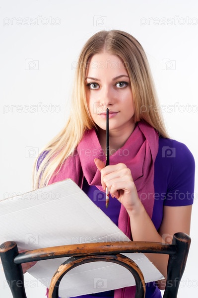 Красивая молодая женщина с кистью сидит на старом стуле