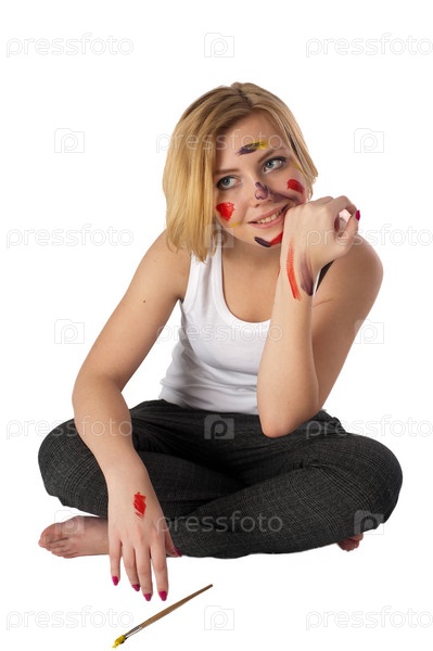 Молодая привлекательная женщина-художник после рисования. Изолированные на белом фоне