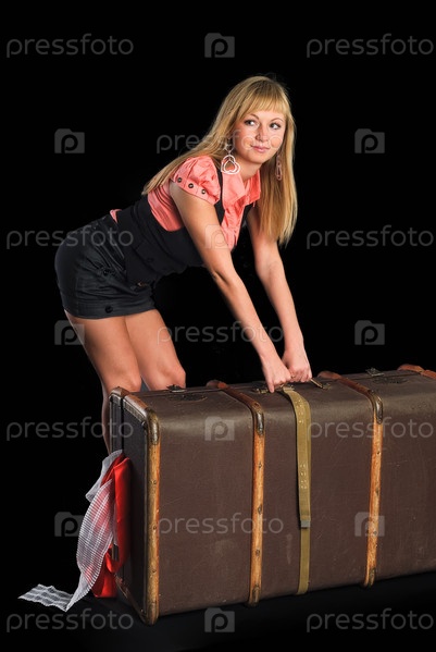 Молодая красивая женщина с улыбкой держит винтажный чемодан, изолированный на черном фоне