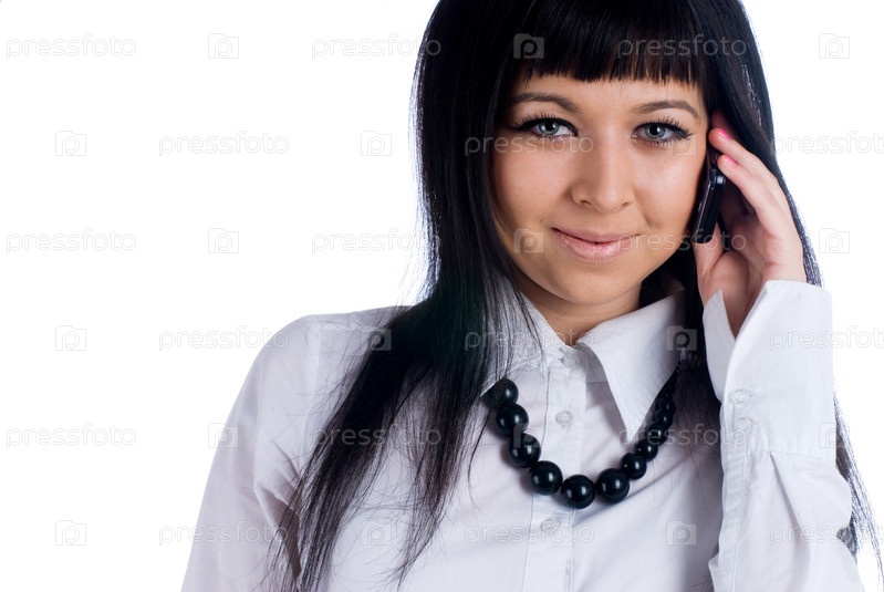 Молодая привлекательная улыбающаяся женщина разговаривает по мобильному телефону на изолированном белом фоне