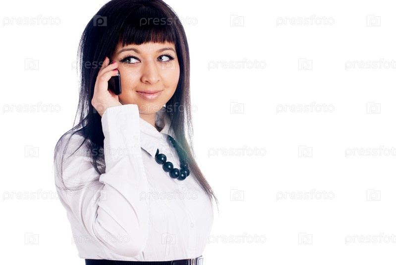 Молодая привлекательная улыбающаяся женщина разговаривает по мобильному телефону на изолированном белом фоне