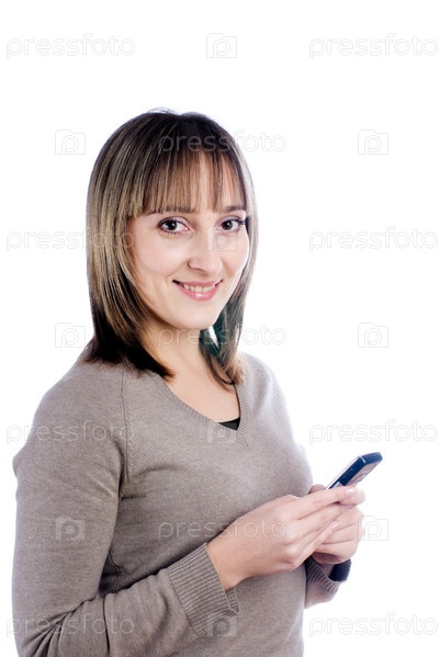 Молодая привлекательная женщина обменивается сообщениями по мобильному телефону, изолированному на белом фоне
