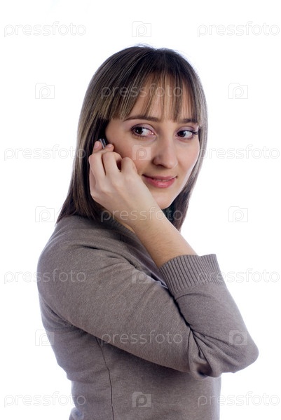 Говорящая женщина по мобильному над белым