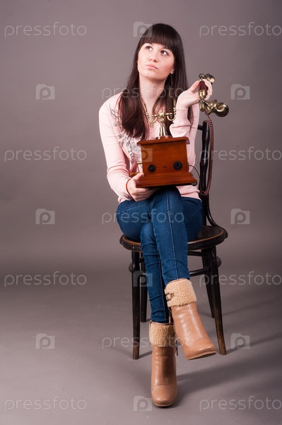 Молодая привлекательная женщина сидит на стуле со старинным телефоном на сером фоне