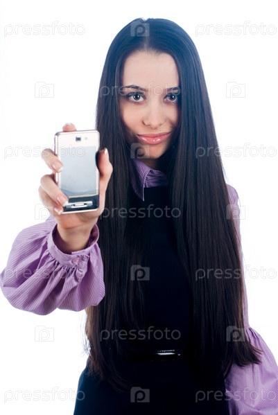 Привлекательная молодая женщина показывает свой мобильный телефон. Изолированные на белом фоне