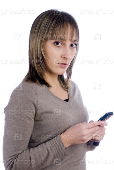 Молодая привлекательная женщина обменивается сообщениями по мобильному телефону, изолированному на белом фоне