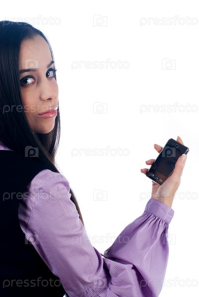 Молодая привлекательная женщина с мобильным телефоном на изолированном белом фоне