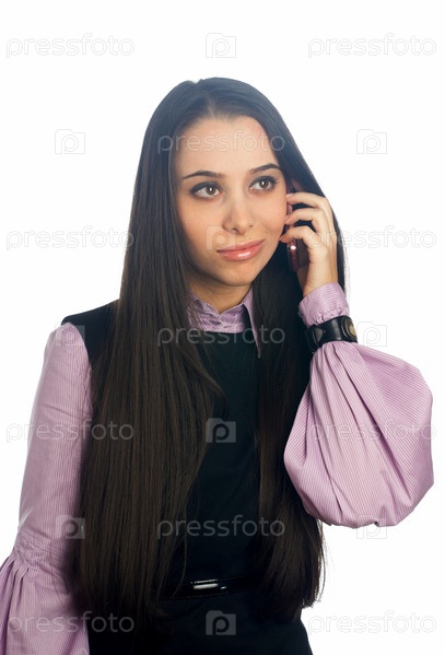 Молодая привлекательная улыбающаяся женщина разговаривает по мобильному телефону на изолированном белом фоне