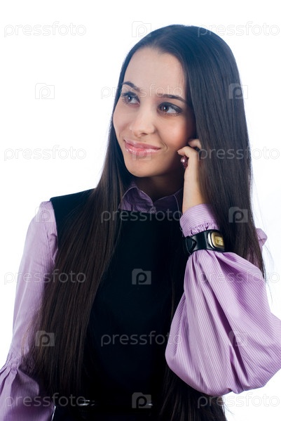 Молодая привлекательная улыбающаяся женщина разговаривает по мобильному телефону на изолированном белом фоне