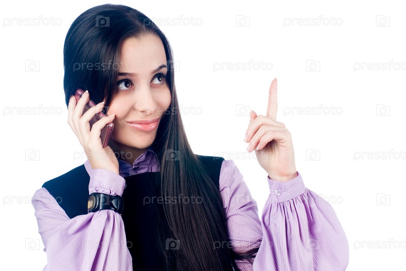 Молодая привлекательная улыбающаяся женщина разговаривает по мобильному телефону на изолированном белом фоне