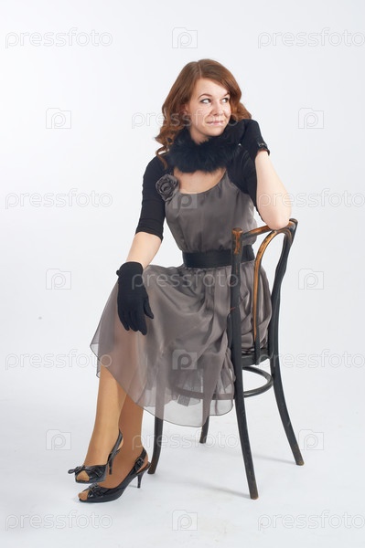 Красивая женщина в платье в стиле ретро сидит на старом стуле