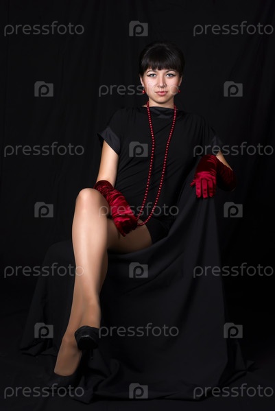 Молодая привлекательная женщина в модных перчатках в студии на черном фоне