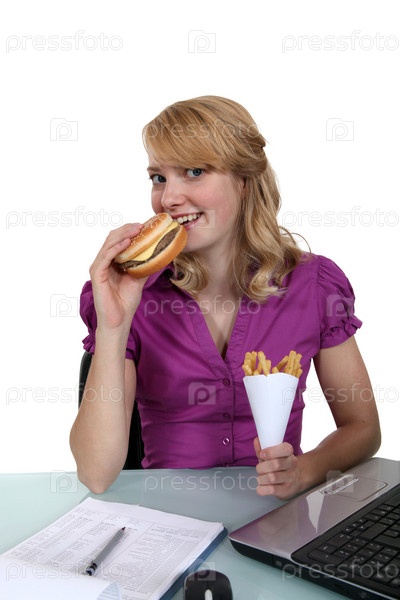Женщина ест чизбургер и картофель фри за столом