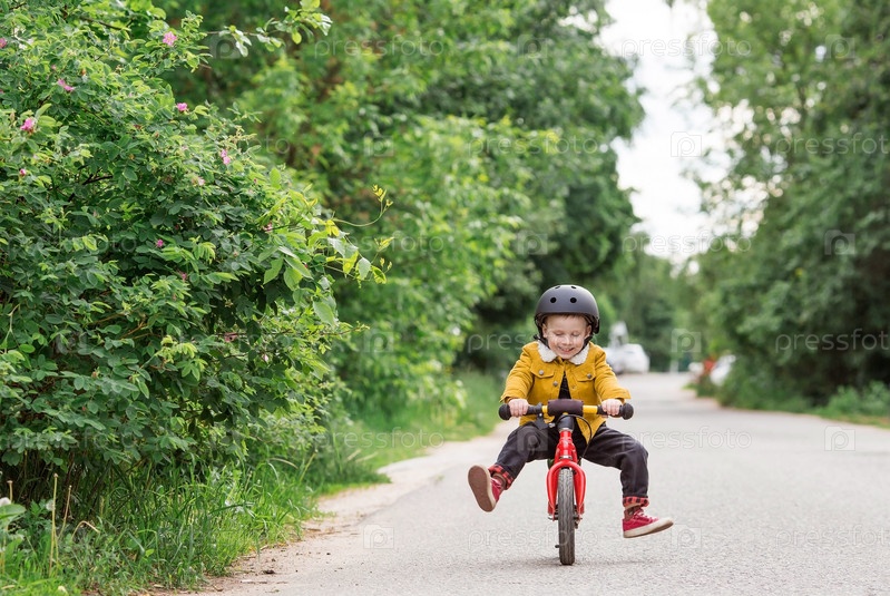 Веселый маленький мальчик катается на велосипеде в шлеме на улице. Счастливый ребенок занимается активным спортом. Защита. Страхование жизни и безопасность детей
