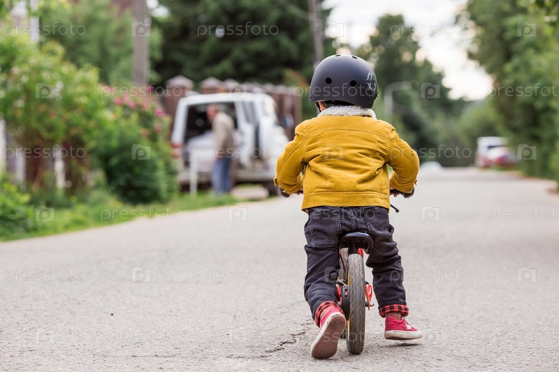 Веселый маленький мальчик катается на велосипеде в шлеме на улице. Счастливый ребенок занимается активным спортом. Защита. Страхование жизни и безопасность детей