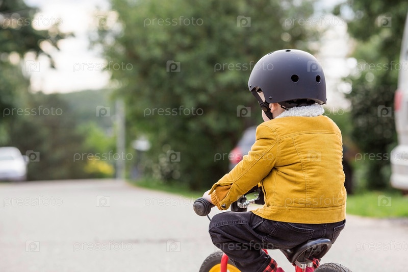 Веселый маленький мальчик катается на велосипеде в шлеме на улице. Счастливый ребенок занимается активным спортом. Защита. Страхование жизни и безопасность детей