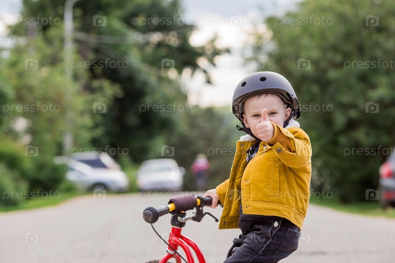 Веселый маленький мальчик катается на велосипеде в шлеме на улице. Счастливый ребенок занимается активным спортом. Защита. Страхование жизни и безопасность детей