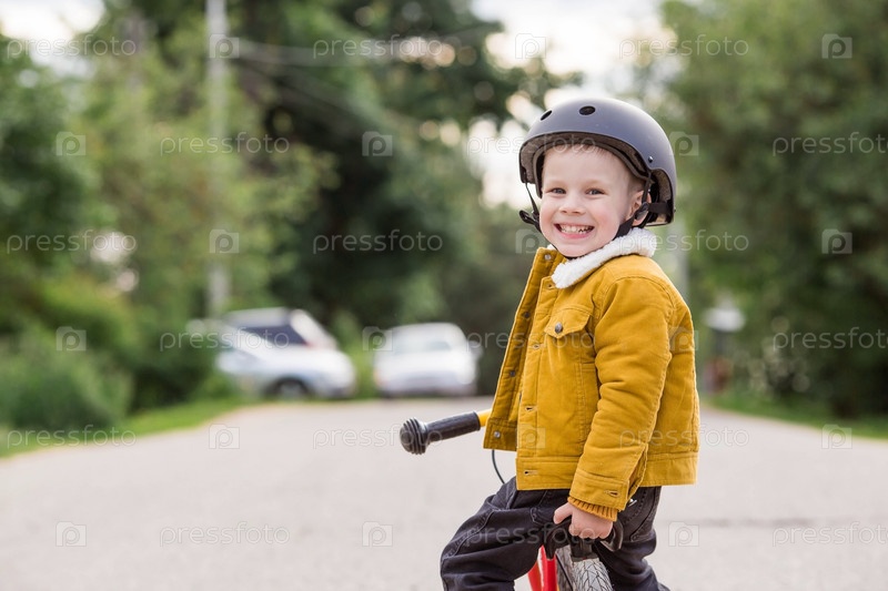 Веселый маленький мальчик катается на велосипеде в шлеме на улице. Счастливый ребенок занимается активным спортом. Защита. Страхование жизни и безопасность детей