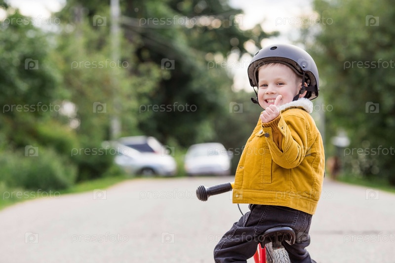 Веселый маленький мальчик катается на велосипеде в шлеме на улице. Счастливый ребенок занимается активным спортом. Защита. Страхование жизни и безопасность детей