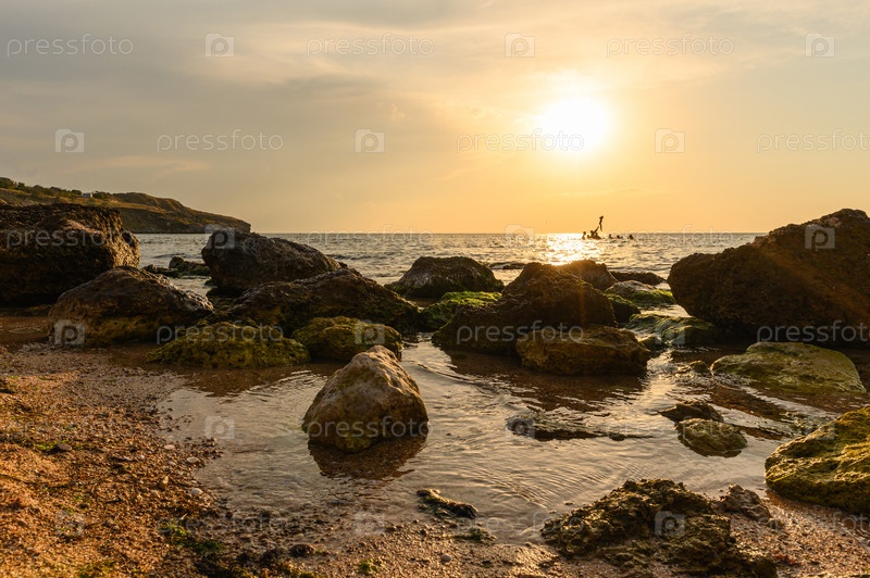 Морской вечер с большими скалами на переднем плане. На заднем плане вдалеке силуэты купающихся