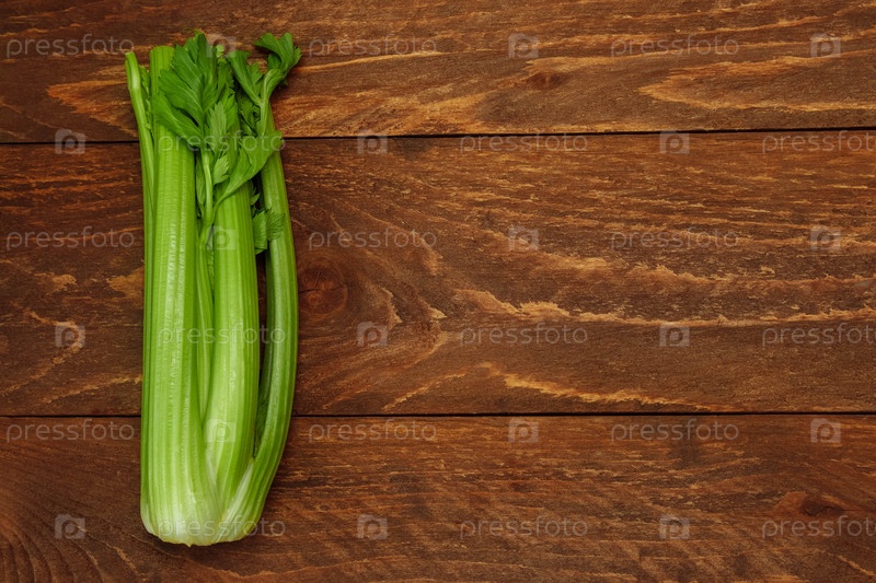 Куча зеленых стеблей сельдерея крупным планом на коричневом деревянном фоне сверху со свободным местом для текста