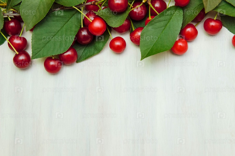 Рамка из ветвей с зелеными листьями и красными спелыми вишнями на белом деревянном фоне с пустым пространством для просмотра текста сверху, концепция сбора и приготовления сока и варенья
