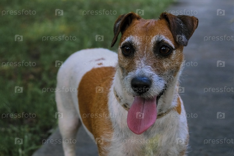 Собака породы джек - рассел бело - рыжего окраса с высунутым языком во время прогулки