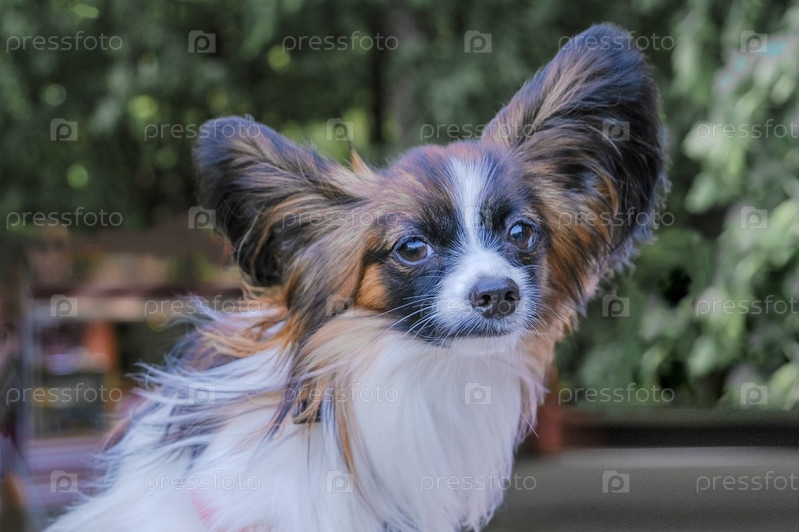 Собака породы папийон с распахнутыми ушами на фоне листвы