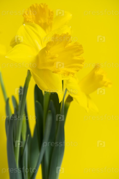 Желтые нарциссы на желтом фоне, букет цветов нарцисса