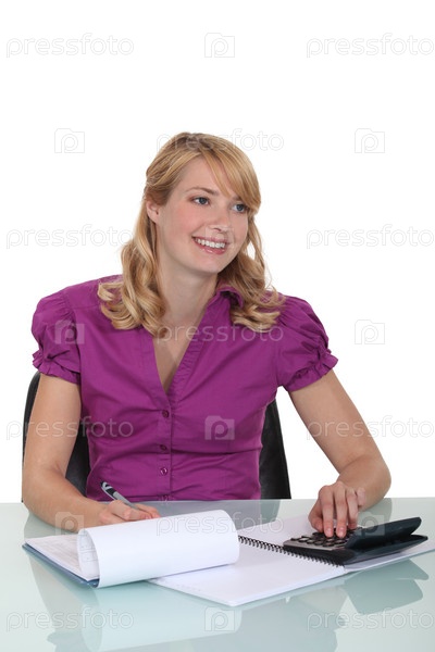 Симпатичный секретарь использует калькулятор