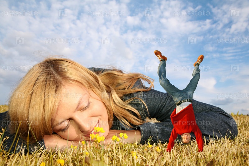 Молодая женщина лежит на траве и смотрит на миниатюрного парня, коллаж