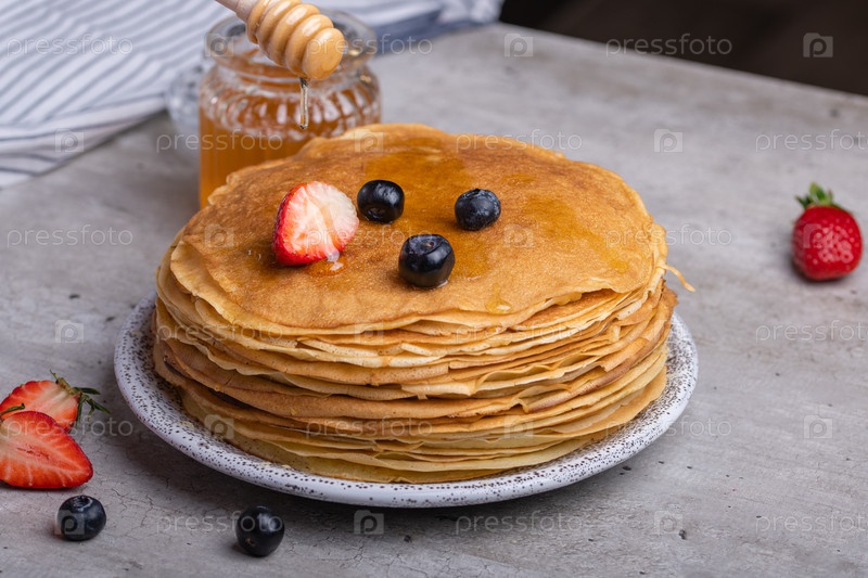 Большая стопка традиционных тонких русских блинов на тарелке крупным планом