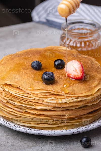 Большая стопка традиционных тонких русских блинов на тарелке крупным планом