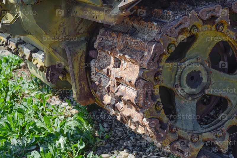 Гусеничная цепь старого танка. Музей военной техники под открытым небом
