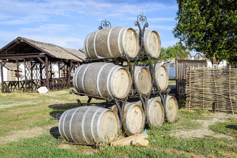 Сложенные винные бочки. Украшение бочек в селе Атаманское