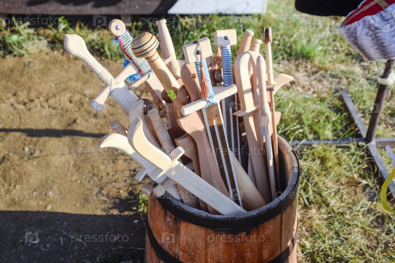 Деревянные мечи в бочке. Резьба по дереву, игрушечное оружие