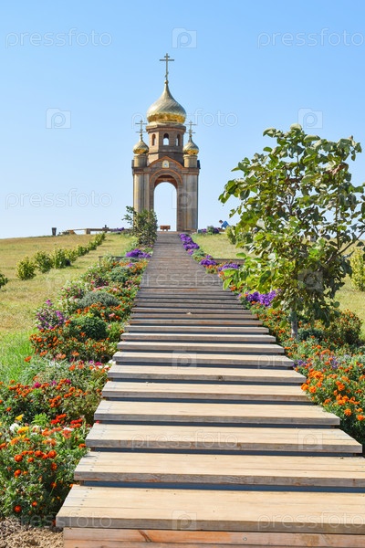 Православная часовня на холме. Скиния в станице Атаманской. Лестница, ведущая в часовню